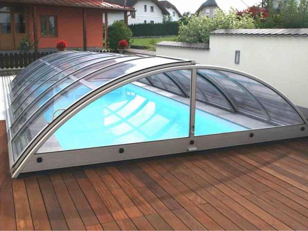 Durch die verschiedensten Variationsmöglichkeiten passend für jeden Pool und Garten. Breiten bis zu 9m. Verglasung mittels 10 mm Polycarbonat-Doppelstegplatten oder 4mm PC, wahlweise in transparent oder blau. Stirnwände mitverschiebbar, hochklappbar oder zum Aushängen ... etc.