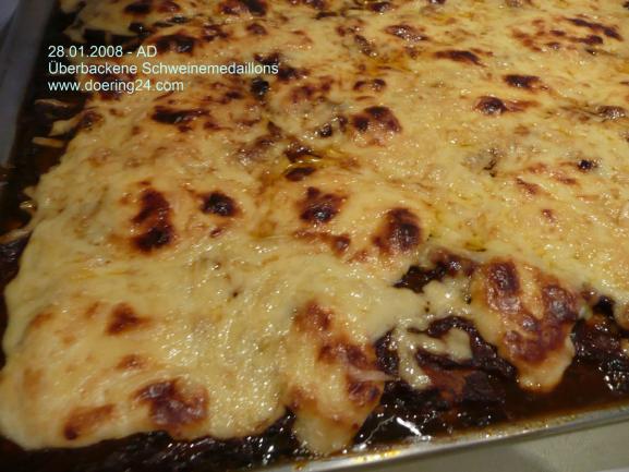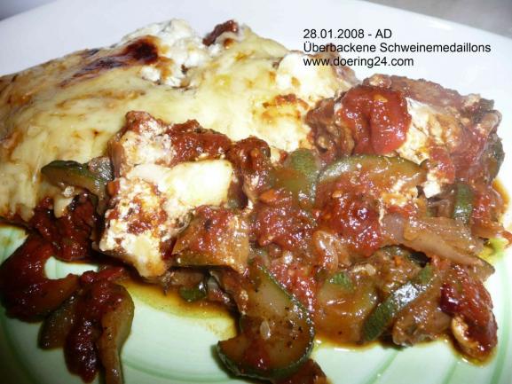Knoblauch pellen und durchpressen. Bei milder Hitze in 3 Esslöffel Olivenöl dünsten. Tomaten mit der Flüssigkeit dazugeben. Bei mittlerer Hitze in der Pfanne so lange schmoren, bis die Flüssigkeit verdampft ist. Zwiebeln pellen, halbieren und in dünnen Scheiben schneiden. Paprika in Streifen schneiden. Zucchini putzen, waschen und in Scheiben schneiden. Das restliche Öl in einen Topf erhitzen. Zuerst die Zwiebeln darin glasig dünsten, dann die Paprikastreifen und die Zucchini dazugeben. So lange im offenen Topf garen, bis die Flüssigkeit verdampft ist. Gemüse mit Salz und Pfeffer würzen. Die dadurch entstandene Flüssigkeit wieder einkochen lassen. Basilikum von den Stielen zupfen und hacken. Unter das Tomatenpüree rühren, das Püree mit Salz, Pfeffer und Zucker würzen. Das Schweinefilet in einarm dicke Medaillons schneiden, die Schnittflächen etwas flach drücken. Das Butterschmalz in einer Pfanne sehr heiß werden lassen und das Fleisch von beiden Seiten kurz darin anbraten. Mit Salz und Pfeffer würzen und beiseitestellen. Das Gemüse auf einem Backblech verteilen, die Medaillons darauflegen und das Tomatenpüree gleichmäßig darüber geben. Parmesan und Gouda grob raspeln. Parmesan mit der Créme fraiche verrühren und mit einem Teelöffel kleine Häufchen davon auf das Tomatenpüree setzen. Zum Schluss den Gouda darüberstreuen und das Ganze im vorgeheizten Backofen bei 200 Grad (Gas 3) auf der mittleren Einschubleiste 20 Minuten goldbraun überbacken. |