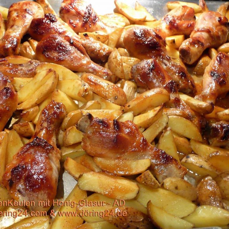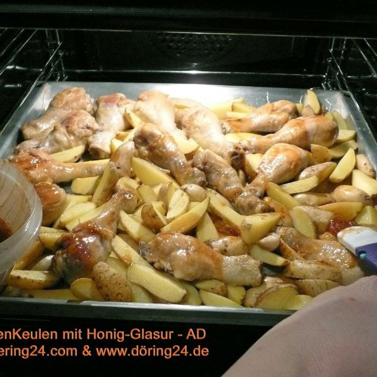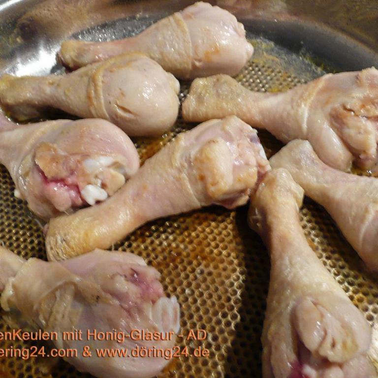 2) Für die Glasur 3 Esslöffel Lindenblütenhonig, Ketchup und Cayennepfeffer verrühren. Nach der Hälfte der Garzeit die Keulen damit einstreichen.