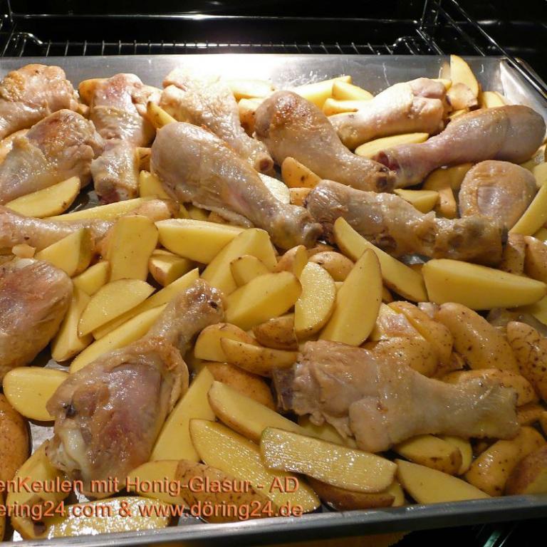 1) Keulen unterfließend kalten Wasser abspülen und mit Küchenpapier sorgfältig trocken tupfen. Anschließend die Haut gut mit Salz einreiben (das macht sie beim Braten schön knusprig) und in 1 Esslöffel Öl unter Wenden ca. 5 Minuten braten. Inzwischen Kartoffeln waschen, dann spalten und gut salzen. Fettpfanne des Backofens einölen, Kartoffeln und Keulen darauf verteilen. Im vorgeheizten Backofen (E-Herd: 225 C / Umluft: 200 C) ca. 20 (Fleisch ist rosa) bis 30 Minuten braten.