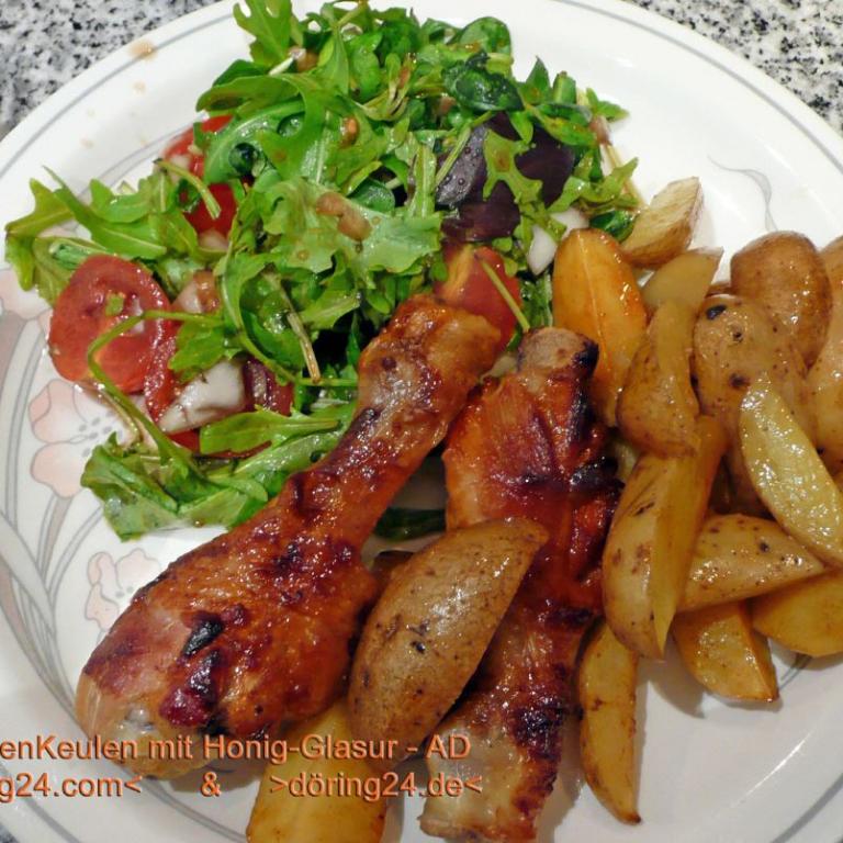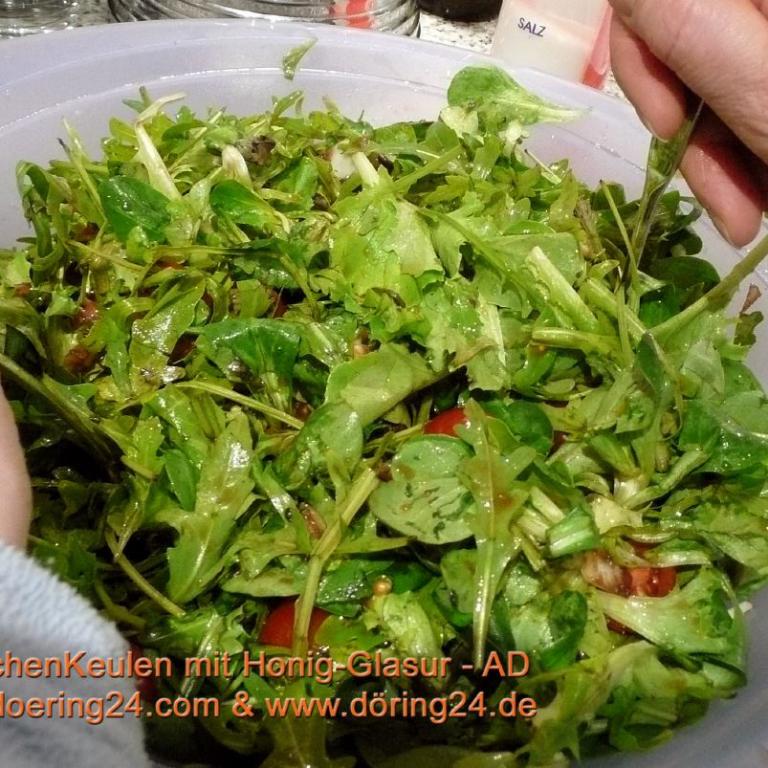 3) Essig, Salz, Pfeffer und 1 Esslöffel Lindenblütenhonig verquirlen. Rest Öl darunterschlagen. Zwiebeln schälen, fein würfeln und unter die Soße rühren. Salat putzen, waschen, trocken schleudern und in stücke zupfen. Tomaten waschen und halbieren. Salat und Tomaten, bis auf etwas zum Garnieren, in Schälchen anrichten und mit Soße beträufeln. Keulen und Kartoffeln auf Tellern anrichten und mit Salatbättern und Tomaten garnieren. Salat dazurechen.