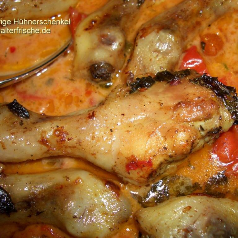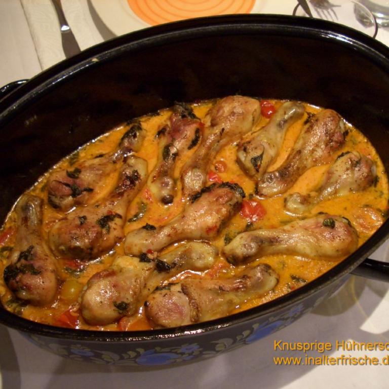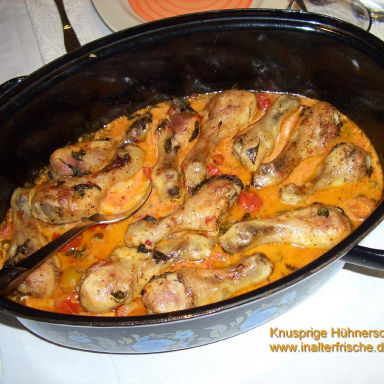1. Keulen waschen, trockentupfen und in einen Bräter legen, würzen. Basilikum waschen, abzupfen, Stängel hacken. Tomaten waschen, halbieren oder vierteln. Knoblauchzehen ablösen, nicht schälen. Chili entkernen, waschen und hacken. |