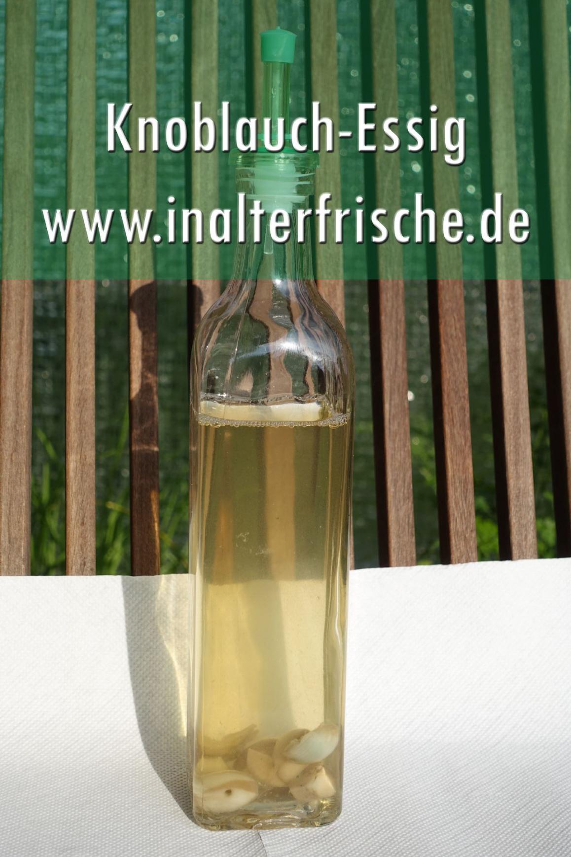 auffüllen. Die Flasche gut verschließen und mindestens 14 Tage an einen sonnigen Ort ziehen lassen. Anschließend den Knoblauchspieß herausnehmen, den Essig durch ein Sieb gießen und anschließend zusammen mit dem Knoblauchspieß in eine gut gereinigte Flasche abfüllen und verschließen.