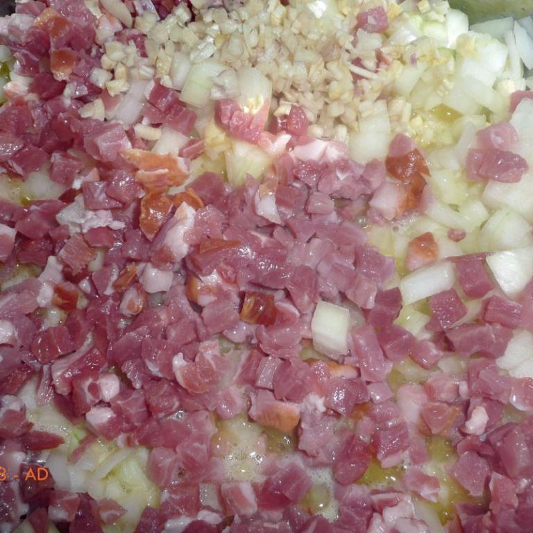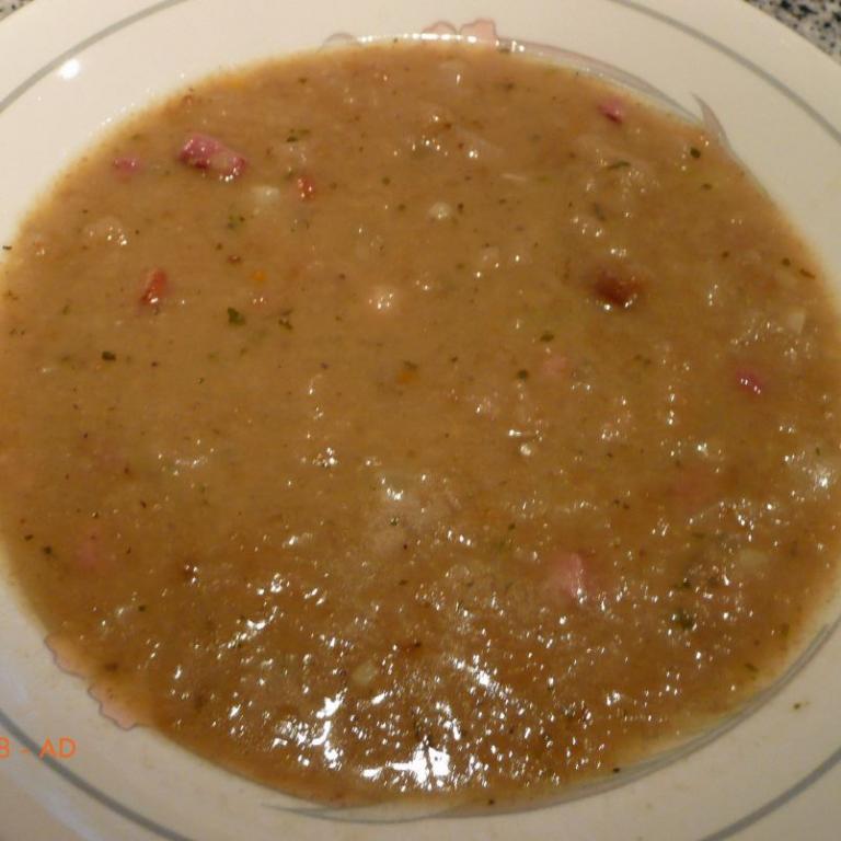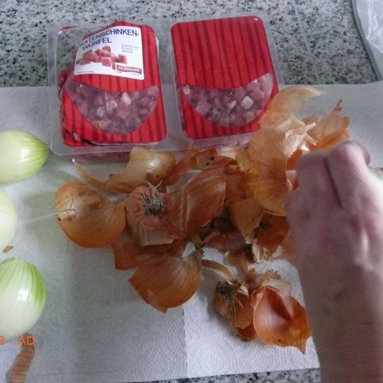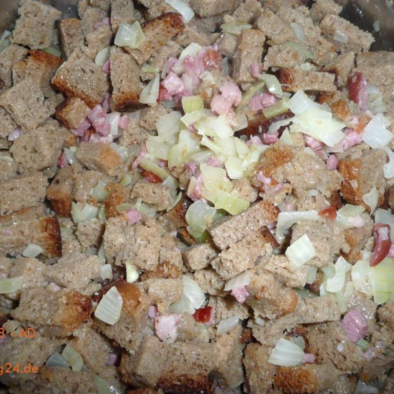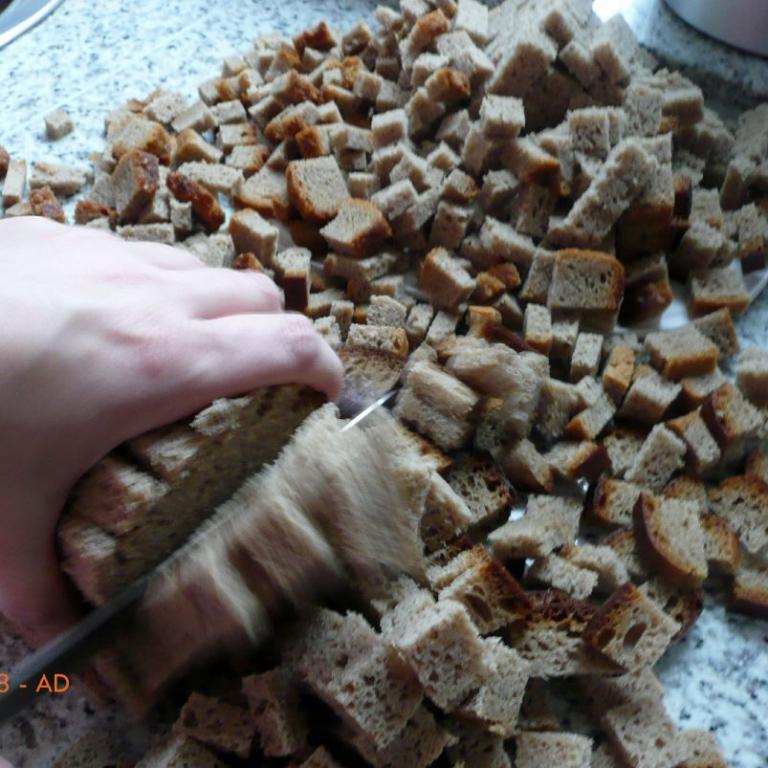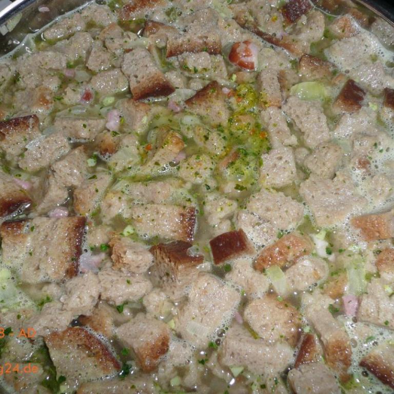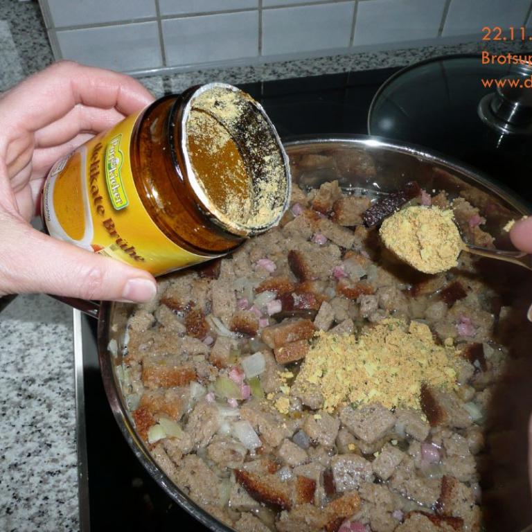 Das in Streifen geschnittene Brot und die zerkleinerte Zwiebel in der Margarine anbraten, heiße Brühe auffüllen, durchkochen lassen und mit den Gewürzen abschmecken. |