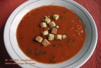 1) Tomatensuppe mit Schneebesen in 1 Liter kochendes Wasser einrühren, Tomatenmark unterrühren und bei schwacher Hitze 1 Minute kochen lassen. |